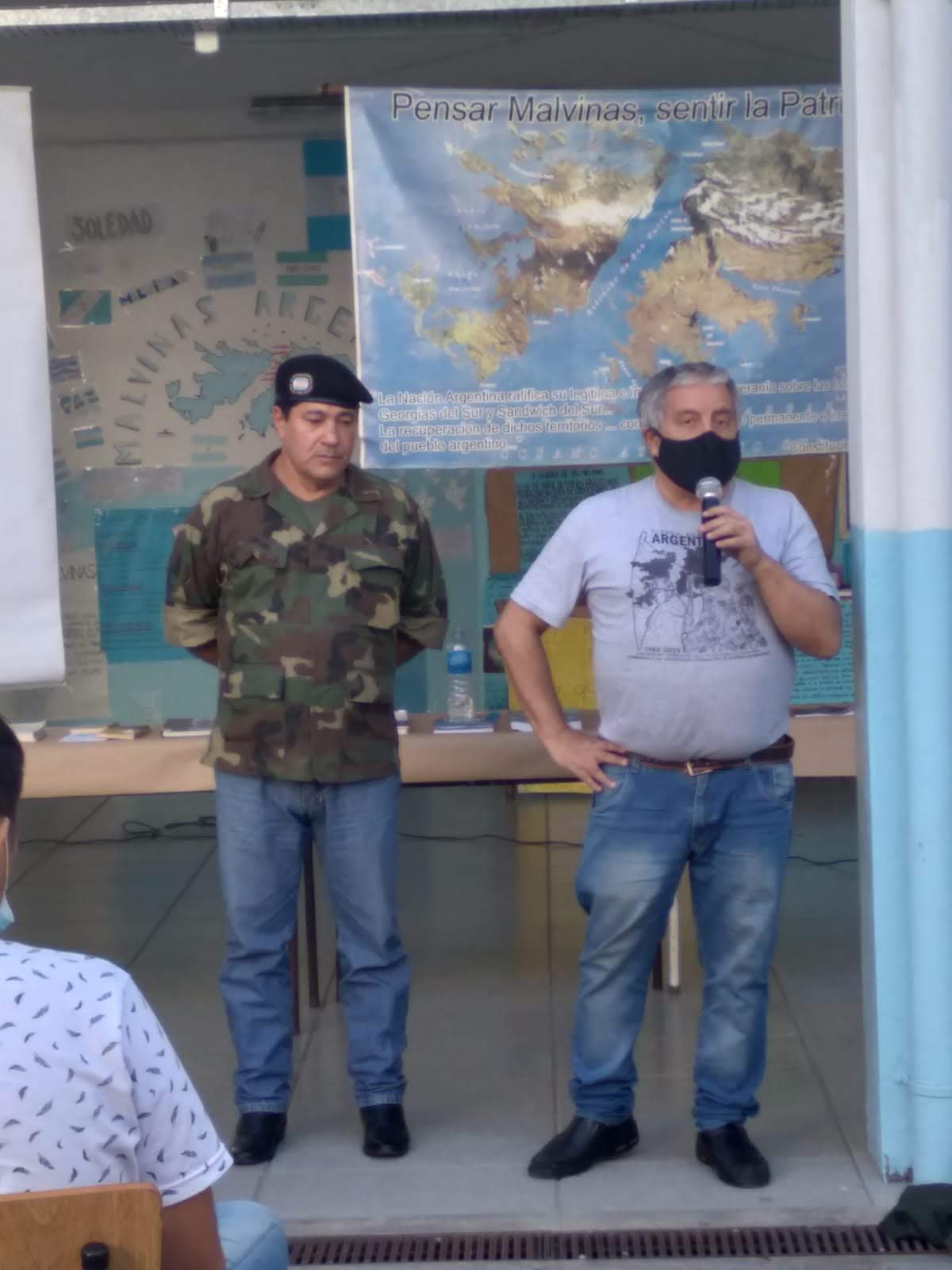 En un momento de la presentación del Sr Montiel nuestro director se saca su saquito azul que tenia puesto quedando expuesto la remera con las Islas Malvinas que en homenaje a los caídos y veteranos de guerra confeccionaron las y los estudiantes de la escuela guiados por el Profesor Mario Medero